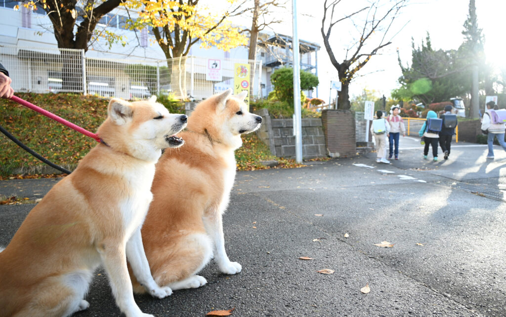 However, in autumn last year, frequent bear sightings in the area changed everything. With safety as the top priority, children have been driven to school by car instead of walking. As a result, Kotaro and Sae can no longer accompany them. Now, during their walks, the dogs stand near the school gate, gazing from a distance at the children arriving, quietly waiting for the routine they once loved.